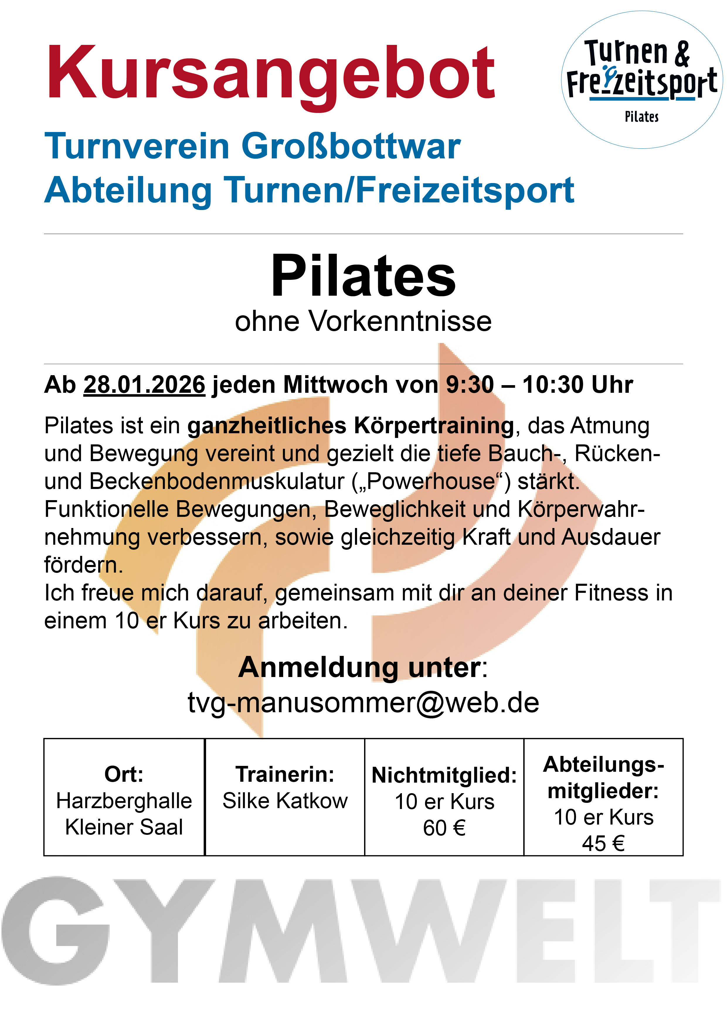 Pilates ist ein ganzheitliches Körpertraining, das Atmung und Bewegung vereint und gezielt die tiefe Bauch-, Rücken und Beckenbodenmuskulatur („Powerhouse“) stärkt. Funktionelle Bewegungen, Beweglichkeit und Körperwahrnehmung verbessern, sowie gleichzeitig Kraft und Ausdauer fördern.